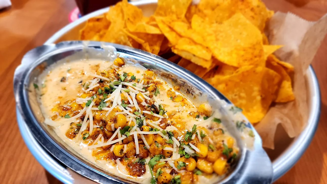 Green Chili Beer Queso, White Cheddar Cheese, Fire Roasted Sweet Corn Combined with Baja Sauce & Parmesan Cheese Finished with Chili Powder & Chopped Cilantro Accompanied with Seasoned Tortilla Chips