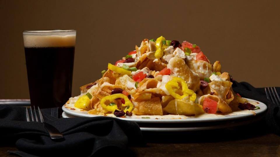 Italian pasta chips topped with Asiago cheese sauce, tomatoes, scallions, kalamata olives, banana peppers, mozzarella cheese, and chicken, black beans, or italian sausage. — chicken & black beans — How do you like yours?